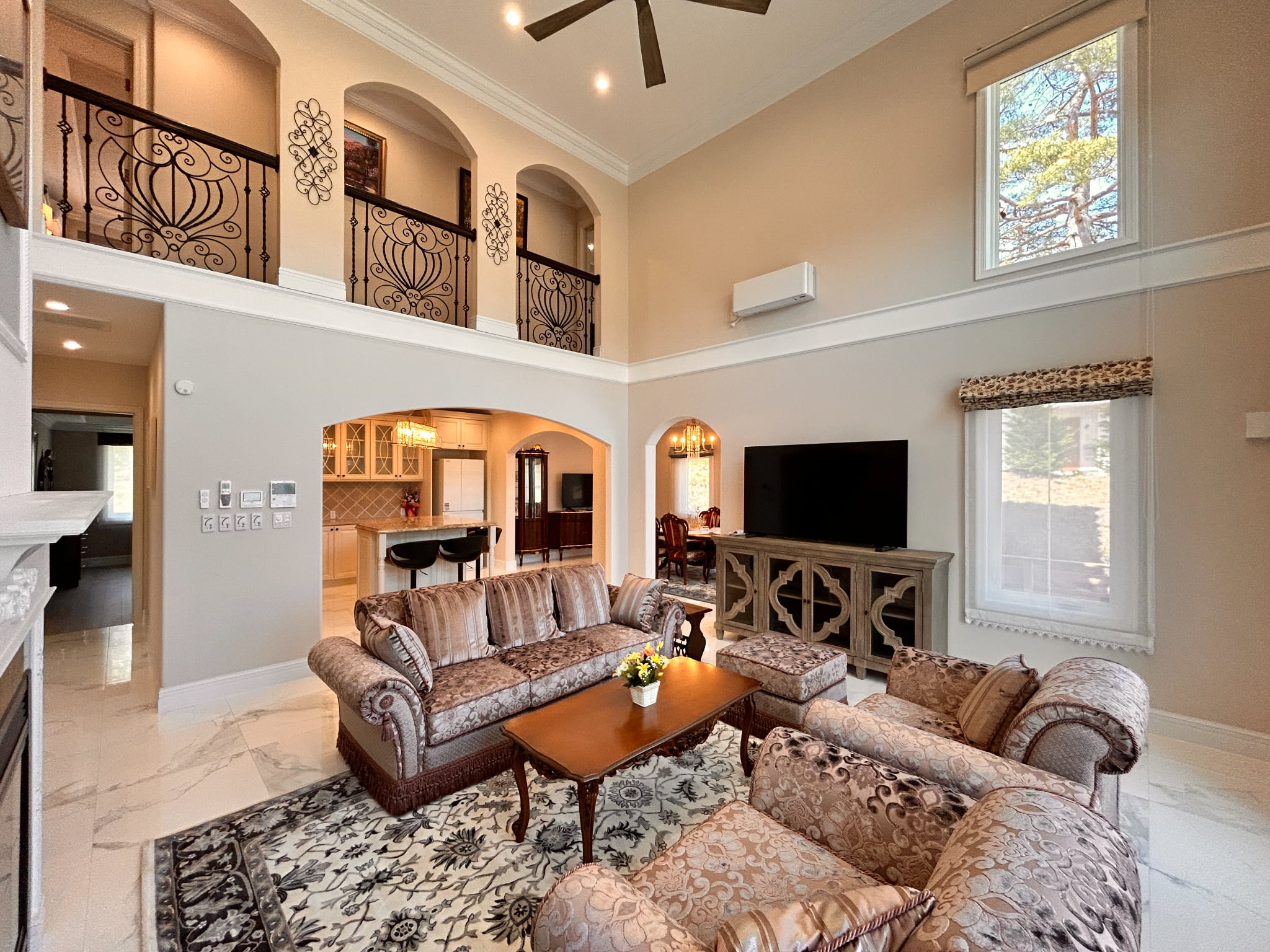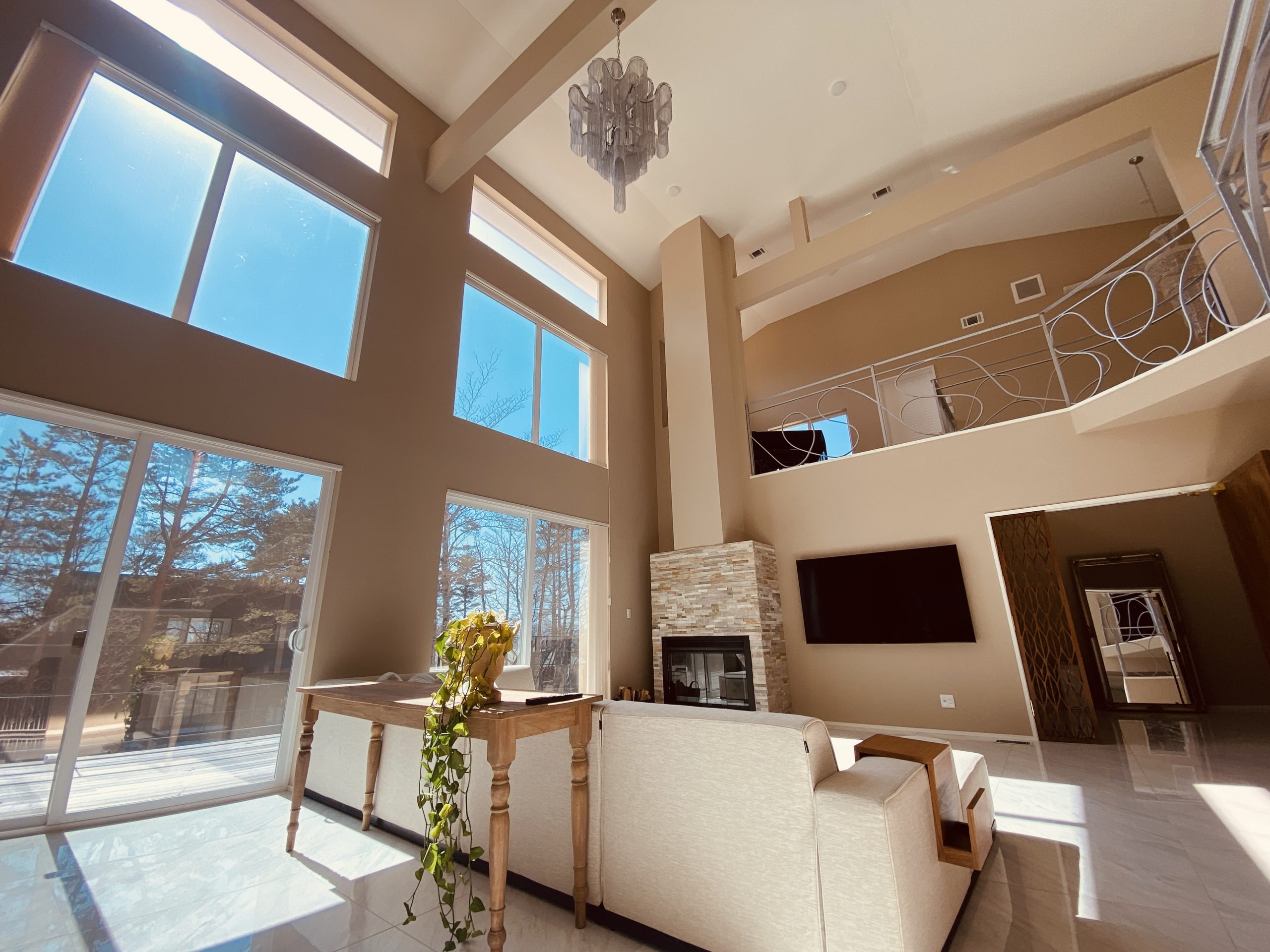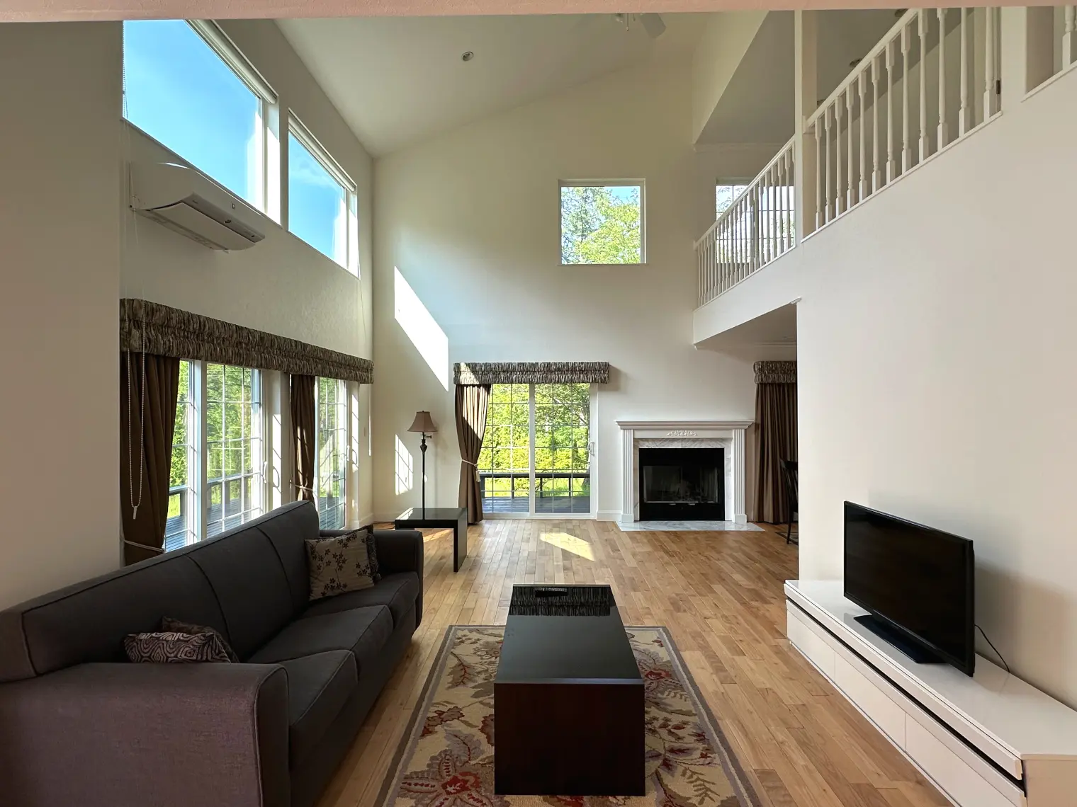 インナーガレージ付きのアメリカンハウス。 吹き抜け部分から自然光が差し込む36畳のリビング、広めのデッキからはドッグランを兼ねた緑の芝庭が広がります。ゲストルームを設け、心地よくお客様をお迎えすることができます。 全館空調冷暖房システムと暖炉により年中快適にお過ごしいただけます。
